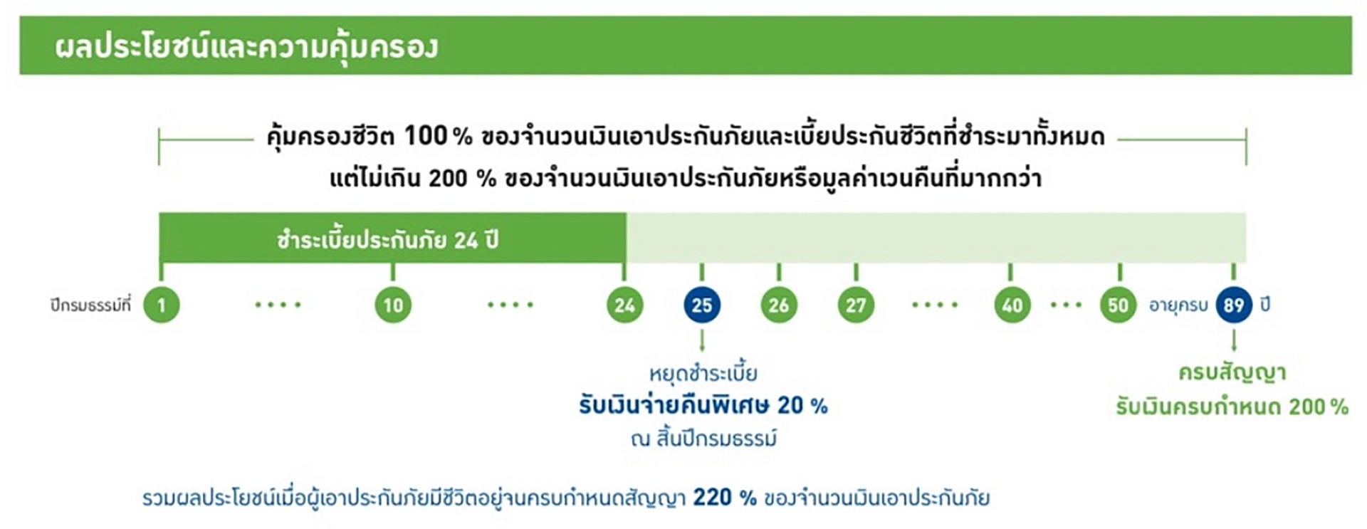 รับเงินคืนพิเศษ 20% ของจำนวนเงินเอาประกันภัย ณ วันครบรอบปีกรมธรรม์ที่ 25