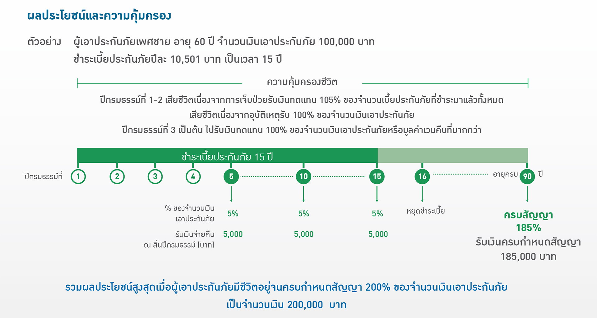 ■ รับเงินจ่ายคืน 5% ของจำนวนเงินเอาประกัยภัย ณ วันครบรอบปีกรมธรรม์ที่ 5, 10 และ 15